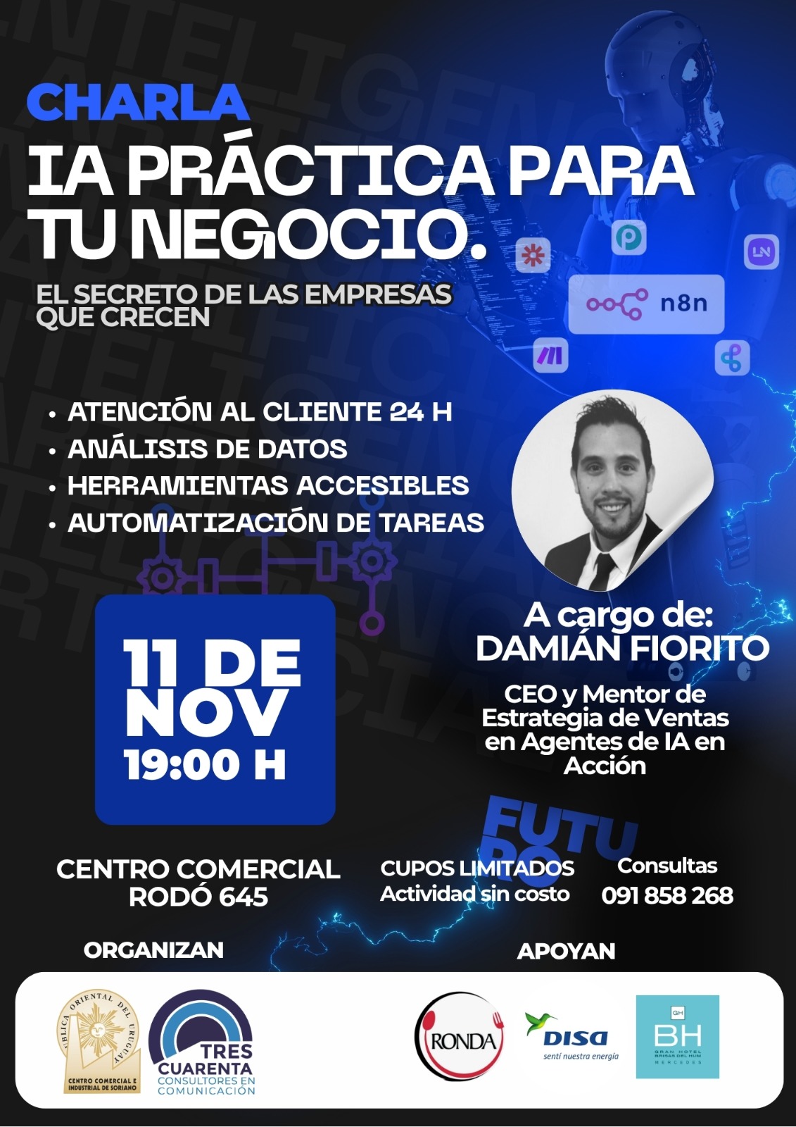 Tres Cuarenta Consultores y el Centro Comercial e Industrial de Soriano te invita a participar de la Charla IA PRACTICA PARA TU NEGOCIO. El secreto